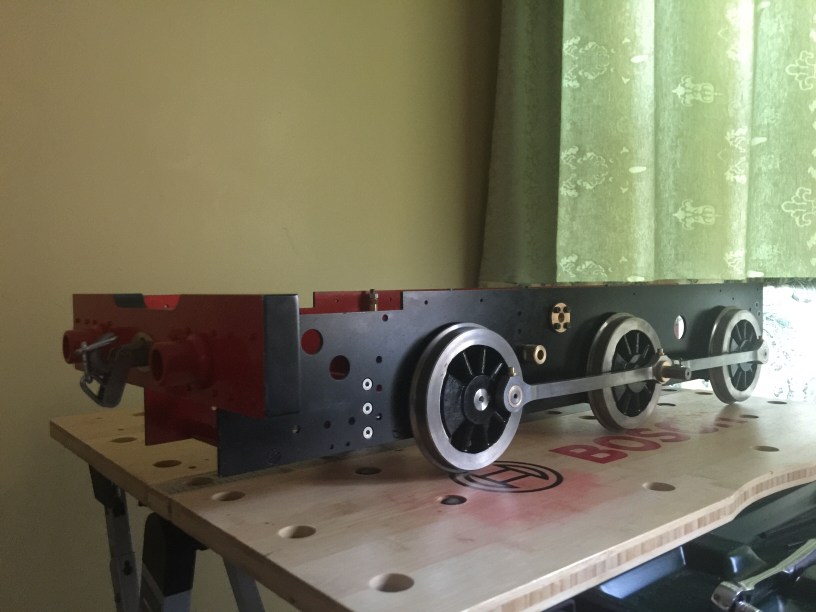 Finally, here are the coupling rods on the wheels. Only one slightly tight spot as they turn but that will “run in” I am told by Polly.
