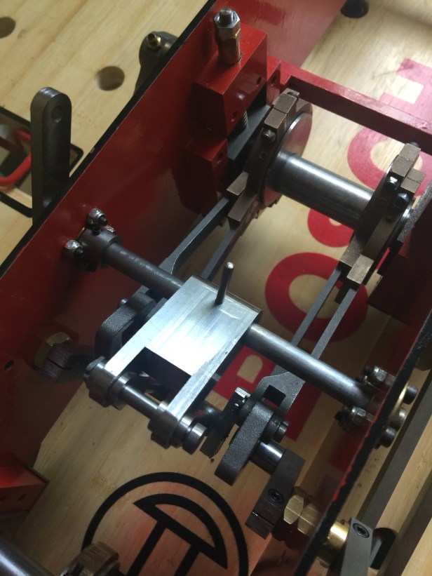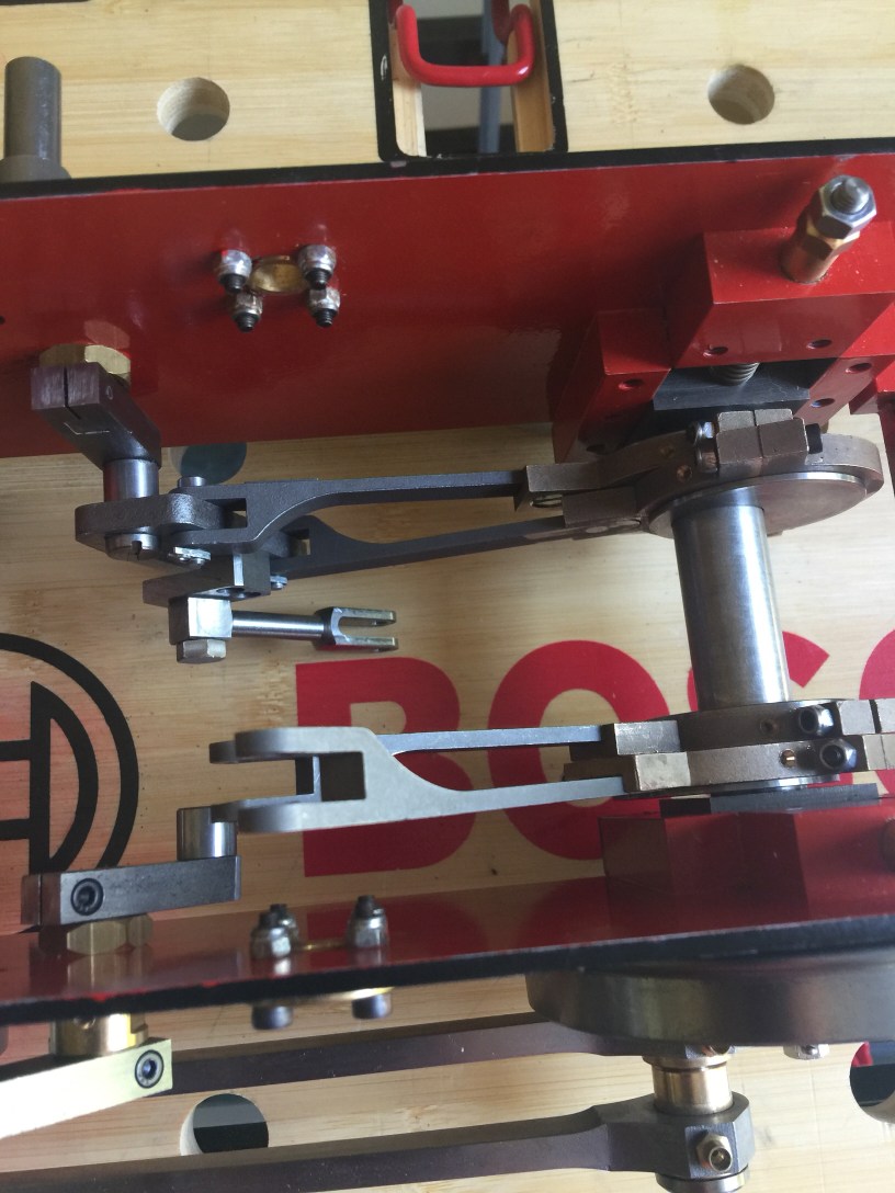 I got stuck in to the eccentrics and made good progress. Below you can see a photo of the rocker mechanism that will drive the valves. I didn’t take a separate photo of the rods and eccentrics which are also attached at the beginning of the process.