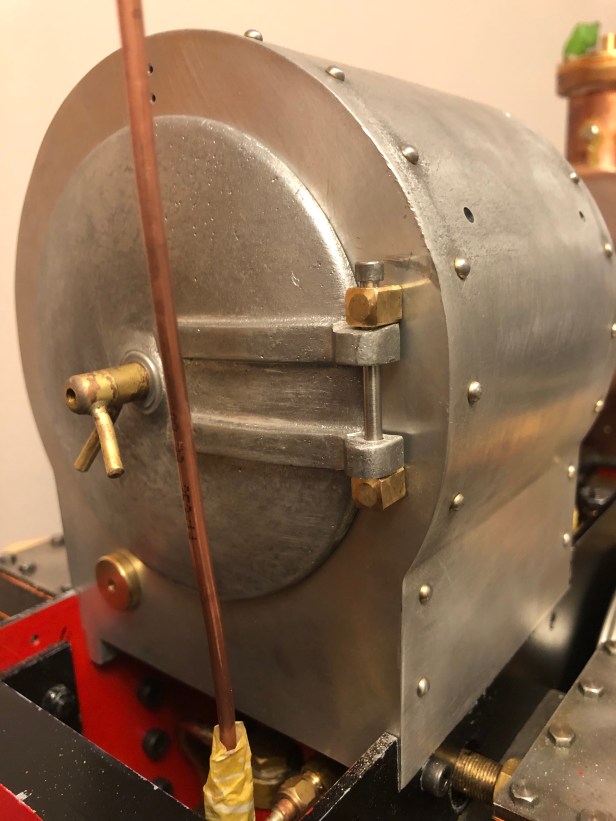 Once that had been done came the second fiddly job; getting all the hinge to align with the right sized holes for the hinge pin to fit through. This is made more difficult by the fact that the hinges on the smokebox are not vertically aligned when tightened so that means that they are a bit wobbly. I have asked Polly whether, on final fit, to use some shim washers or to threadlock the hinges in place. There is no point now as all of it will come off for painting.
