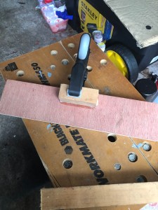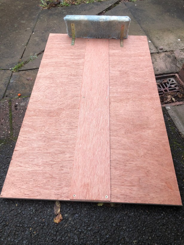 My board is made with 12mm ply. It has a double thickness under the middle to reinforce and also to raise the board to the lip of the boot of the car. It also provides a means to get fingers underneath to lift the board. The “track” to guide the wheels is a thin strip of ply cut to the gauge inside the flanges. This is attached with glue and screws.