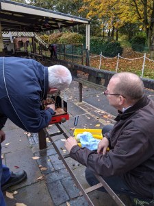I knew that she was stiff but with some regulator we shunted her onto the track. Once there, however, she seized. Nothing seemed to want to make her budge. Fortunately Mark Dale was on hand to help. He managed to lever the spokes of a wheel to get the mechanism free enough to move again.