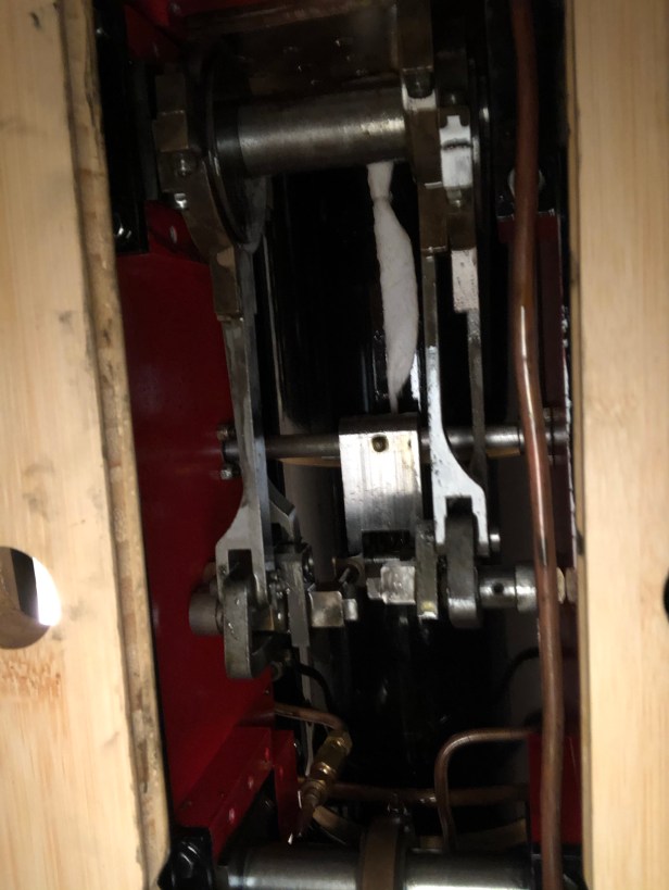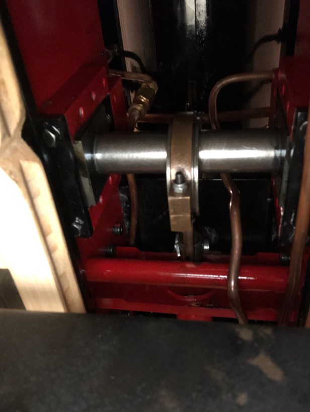 The first “issue” I have come across was the eccentric for the water pump. There seemed to be a wobble which I suspect was caused by the grub screw not quite settling in the detent on the axle when I initially fitted it. Now it has been run and worked for the first time this has settled. When run on air, the water pump was not having to work at all. So I slackened off the top eccentric bolt and removed the bottom one and with some carefully manoeuvring I found the hole in the eccentric with the grub screws.